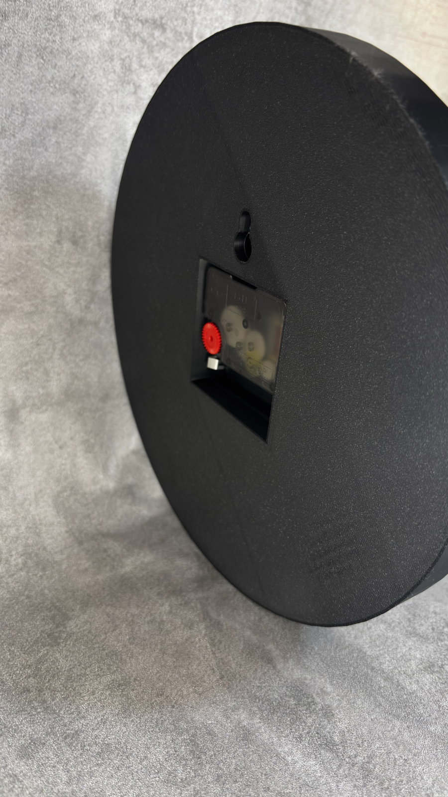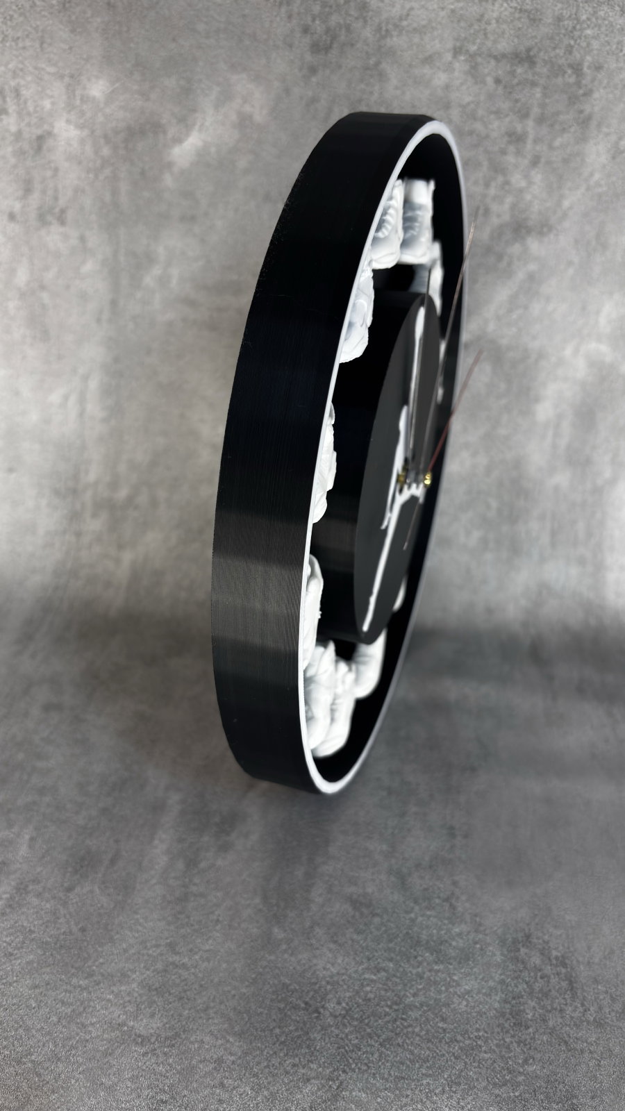 Realizat prin printare 3D, acest ceas combină designul minimalist cu detalii bine definite, fiind potrivit pentru cameră, birou, studio sau spații cu personalitate. Contrastul dintre fundalul negru și elementele albe oferă un look curat și modern.