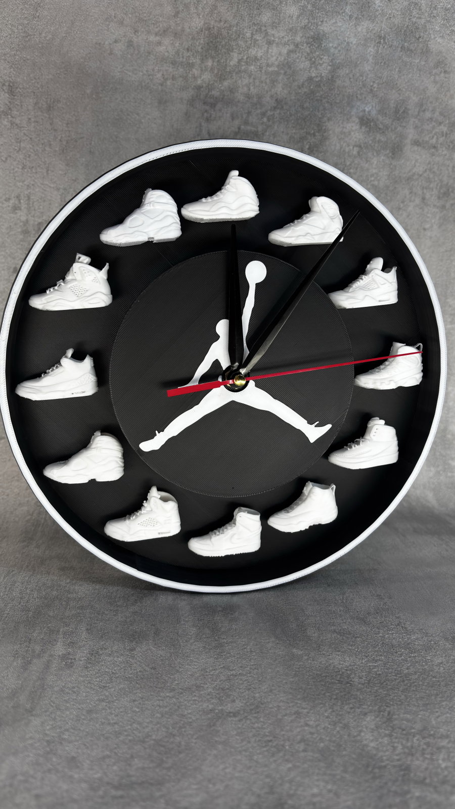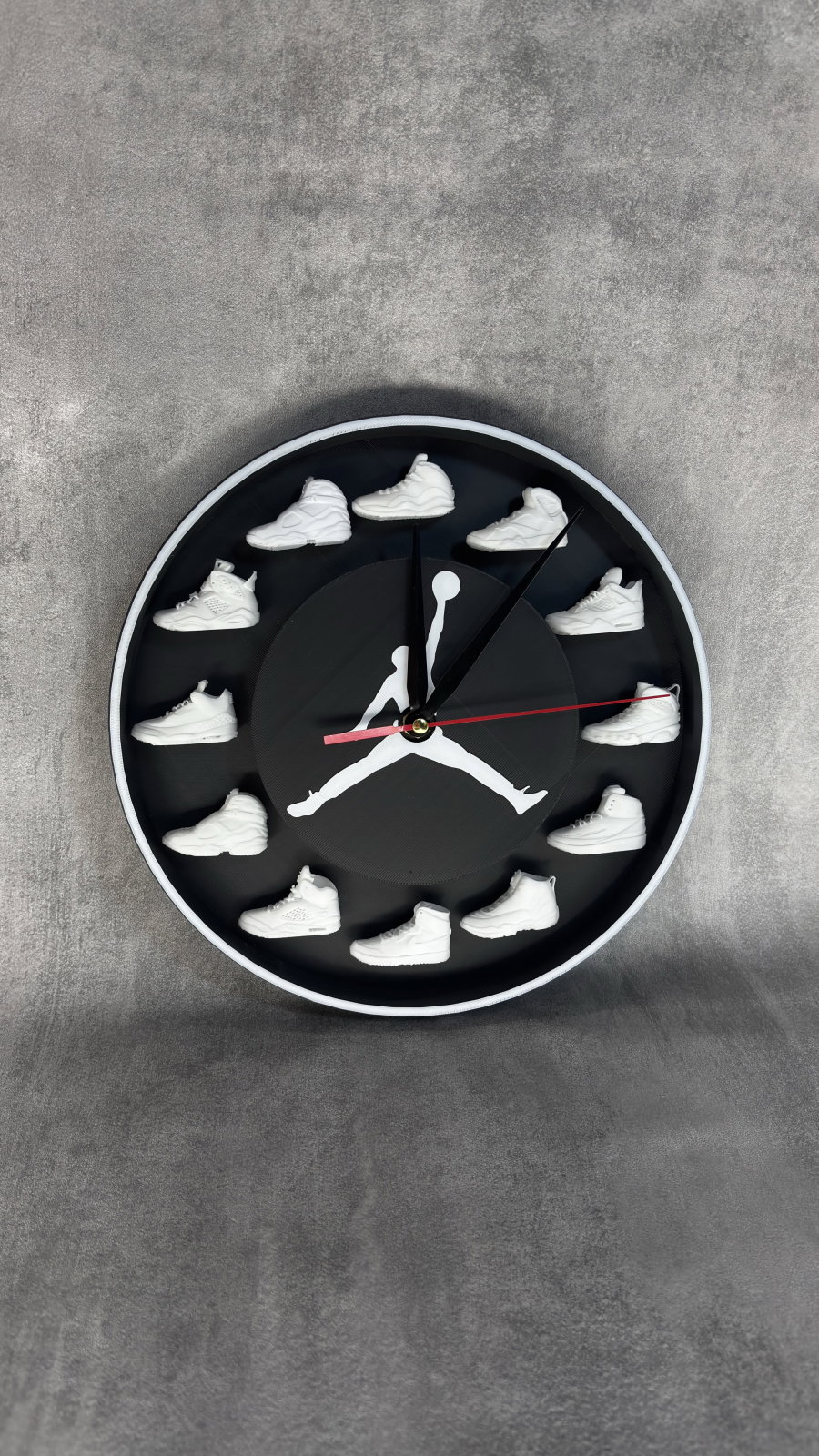 Ceasul de perete printat 3D, cu design inspirat din sneaker culture, este o piesă decorativă modernă, creată pentru pasionații de streetwear și stil urban. Modelul evidențiază siluete de sneakers dispuse circular, oferind un aspect unic și ușor de remarcat în orice încăpere.